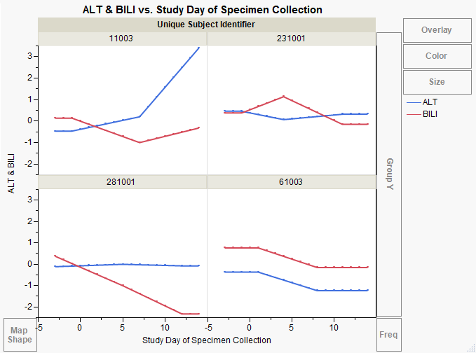 In the trellis plot shown above, the single difference between small plots is the subject (Unique Subject Identifier), (ALT) (blue) and BILI (red) can easily be contrasted both within and between subjects, over the time course of the study (Study Day of Specimen Collection).
