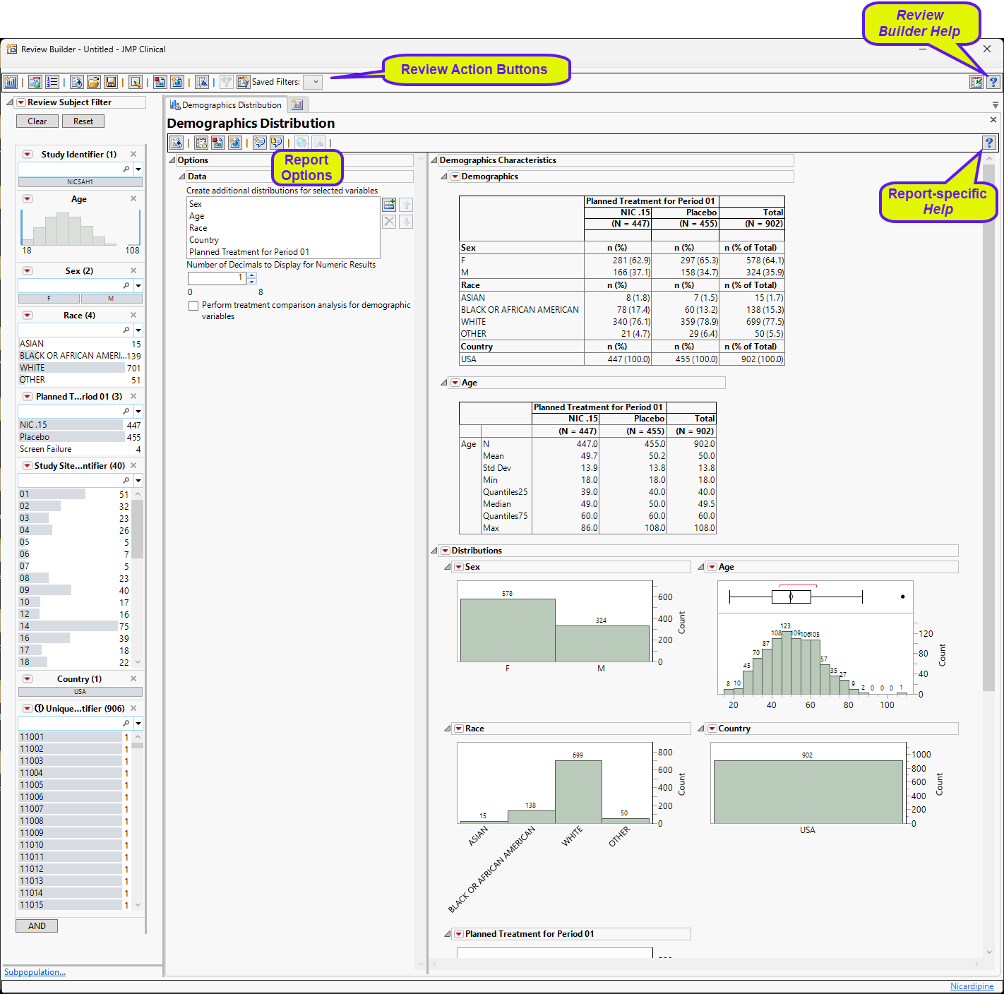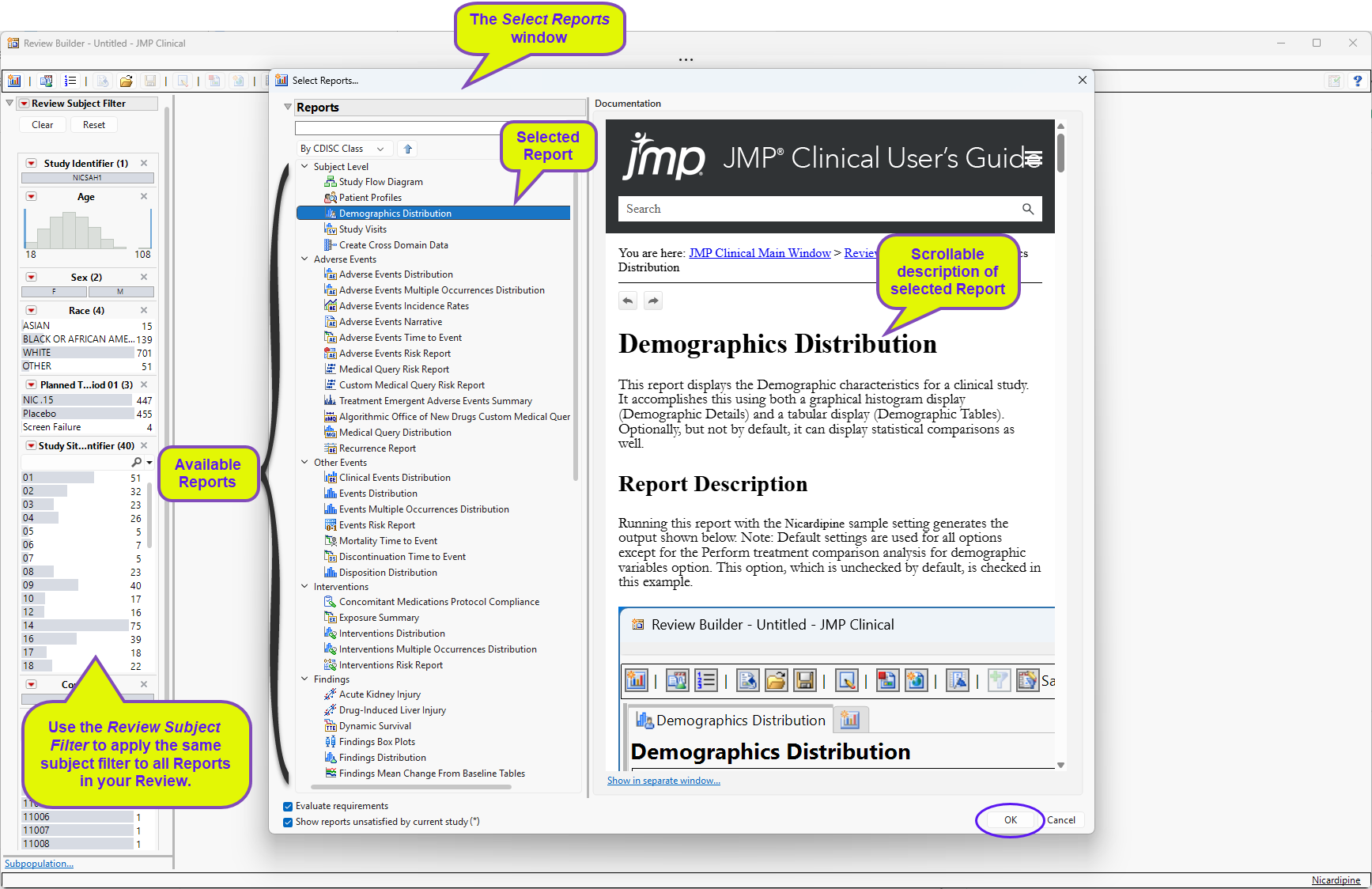 Create Subject Filter: Click to generate a subject-specific filter that can be applied to all subsequent reports run for this review. Only those patients specified by the filter are carried through the analyses.