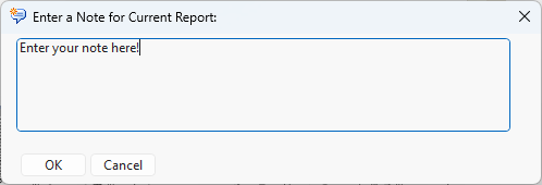 | • | If no subject is selected, a window titled “Enter a Note for the Current Report:” is launched. Enter text into the field and click . A single note (record) is added to the notes data set with the current date-time, the report name, the study name, snapshot number, and your user ID. Notes at the report level lack a subject ID. |