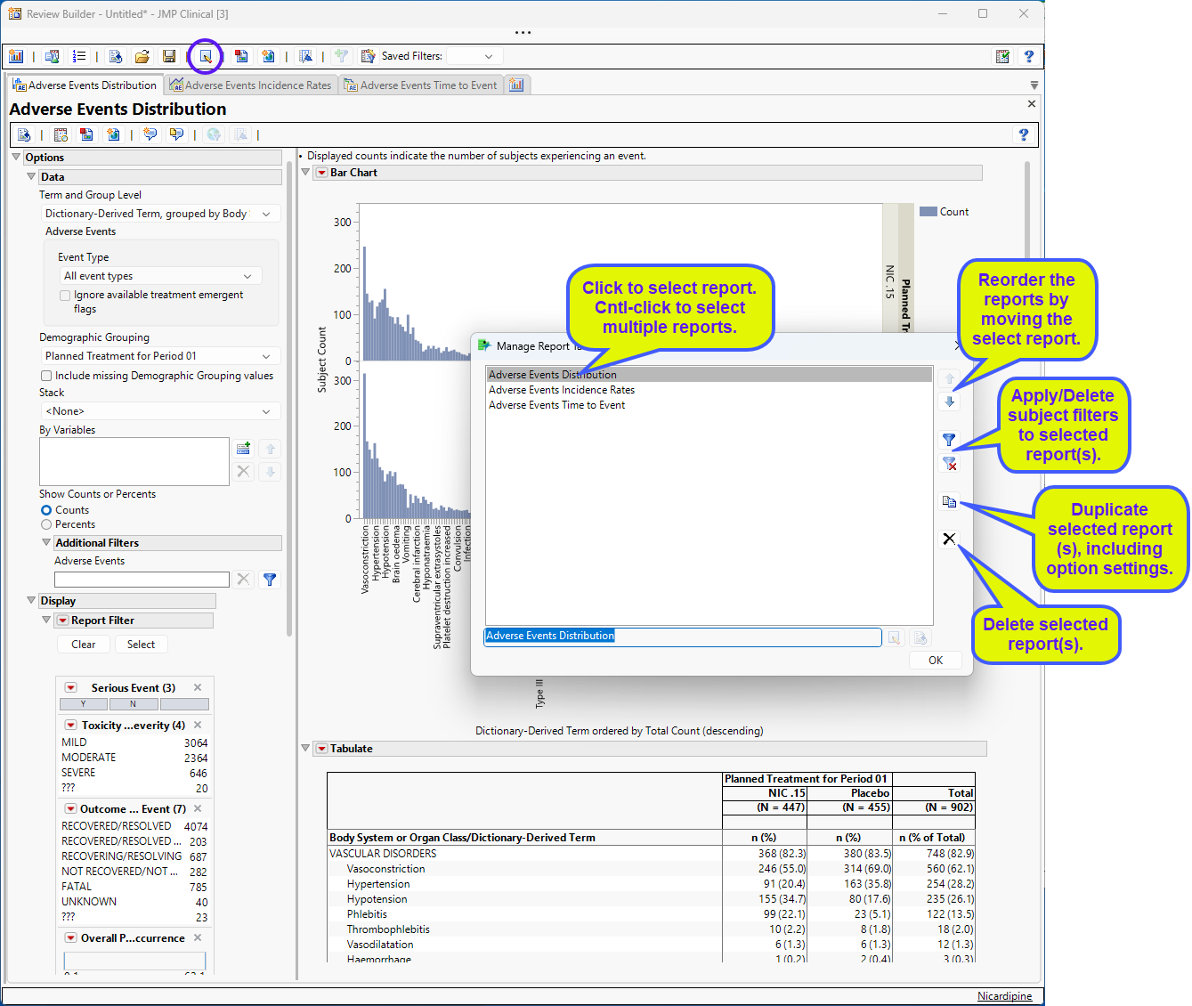 | • | Duplicate reports: Click to add duplicate selected reports and include parameter settings. For example, you might want to add three Findings Time Trends reports, all with changes from baseline setting and showing standard error bars, differing only in the domain being analyzed. |