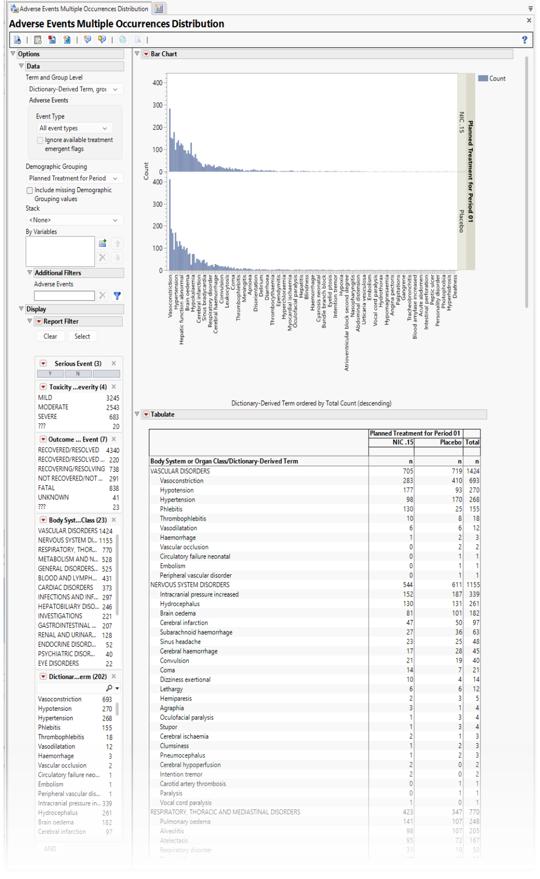 Running Adverse Events Multiple Occurrences Distribution with Nicardipine generates the results shown below. Differences with other reports are noted throughout this output description.