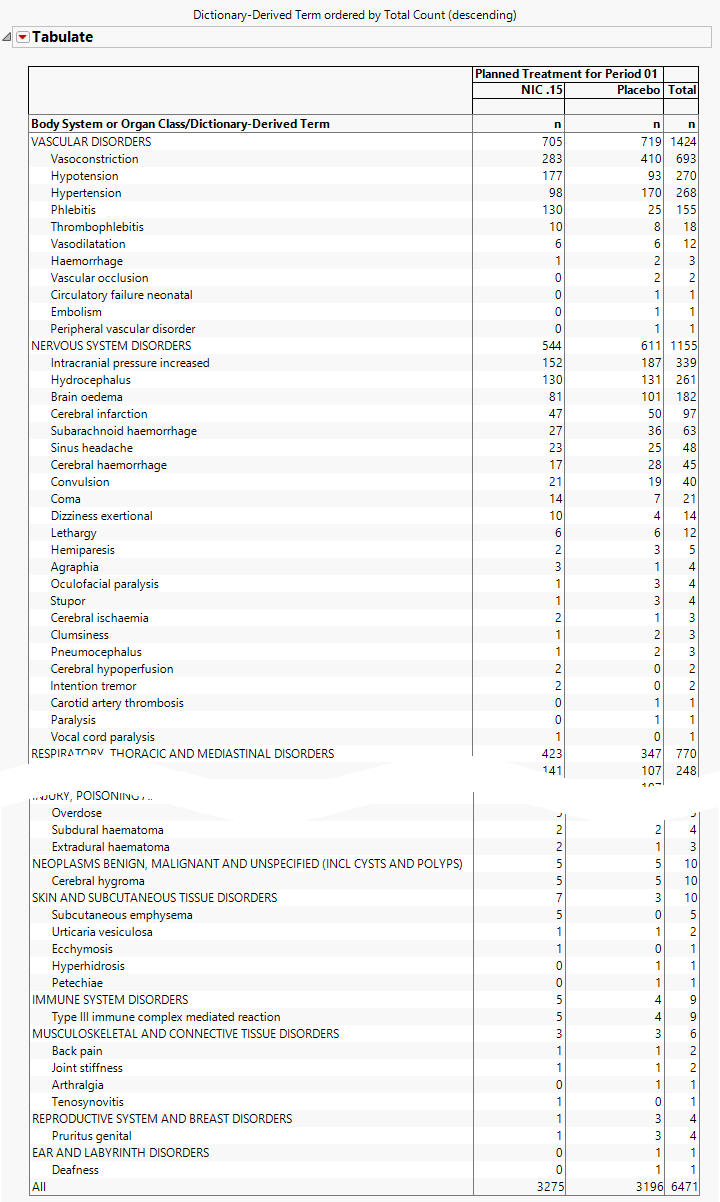 The Tabulate section contains one Table detailing the counts for each treatment group, for each dictionary-derived term within each body system or organ class. The counts, represented by n, are the number of subjects who experienced the given adverse event. The All row at the bottom of the table is the total number of adverse events in the given treatment arm.