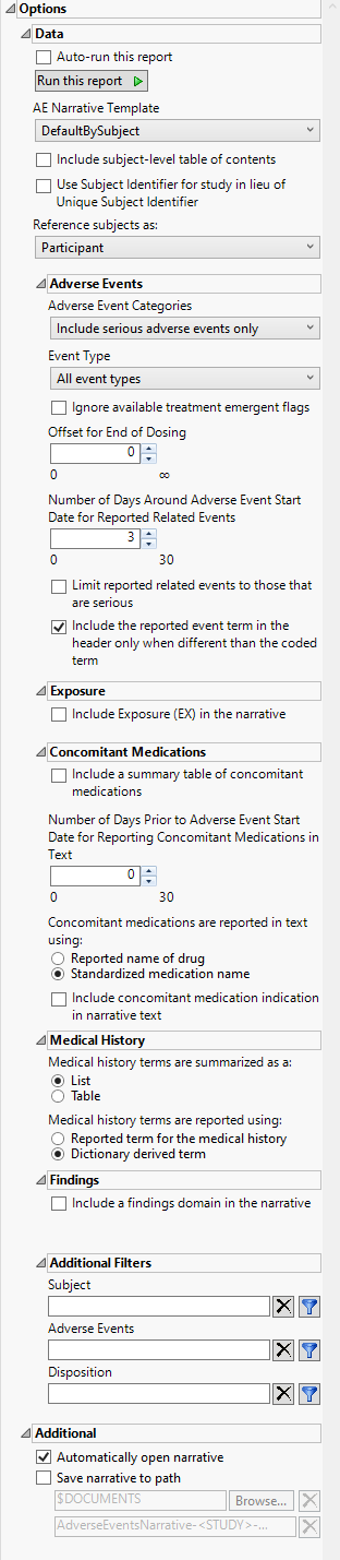 Check this box to automatically save the narrative output to the specified location. Your Documents folder is specified by default. The narrative rtf file is identified as AENarrative-<Study>-<Date>-<Time>, where <STUDY> is the name of the study and <Date>-<Time> is the date and time the narrative was run.