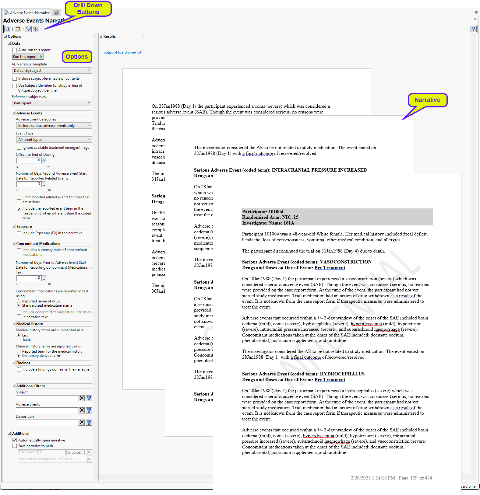 A narrative, containing descriptions of all of the observed adverse events, is generated for each patient. The narrative for the Nicardipine example is 473 pages long. In the example shown here, subject 101004 experienced 5 adverse events that are described over 3 pages.
