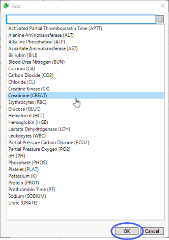 | 8 | Click to open the Add window (shown below) that lists available test names (shown below). |
