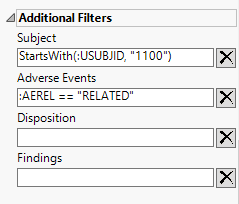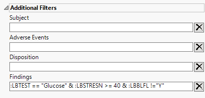 These filters let you restrict your analysis to only those subjects that meet specific criteria at the domain level. Applicable domains include Adverse Events (AE), Disposition (DS) , Findings (EG, LB, VS, etc., depending on the domain specified above), and Subject (ADSL or DM). Filters use JMP WHERE clauses to Select Rows that meet the specified criteria. To use these filters, you must enter the JSL (JMP Scripting Language) expressions that constitute the WHERE clause in the appropriate text box for specific filtering of AEs, Disposition, Findings, and/or Subjects. Note: This is an advanced concept that not only requires some basic knowledge of the JSL where clause syntax (similar to, but different from, SQL), but also an understanding of the exact variables in the tables in the study.
