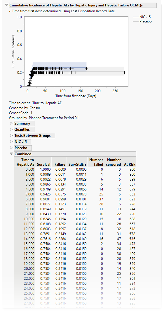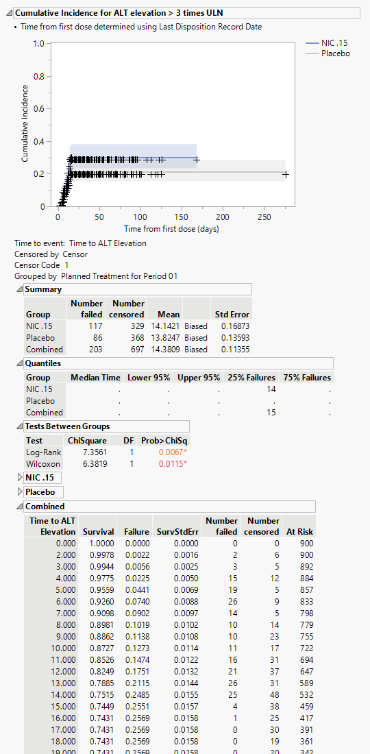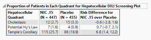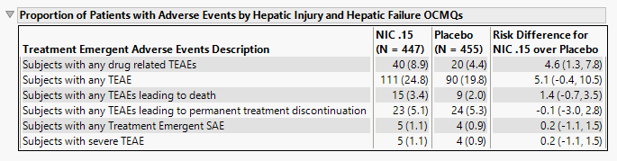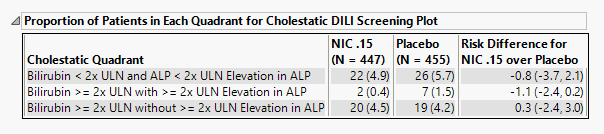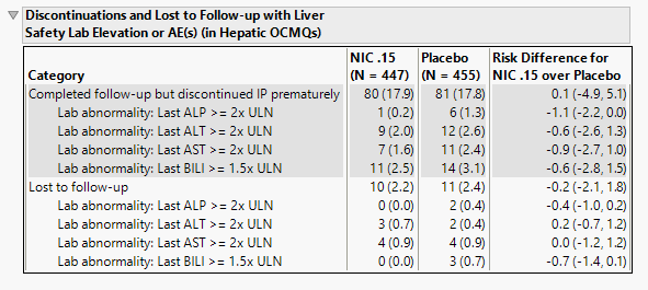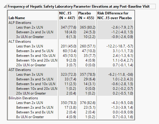 | • | A table of Counts, Percents and risk differences for elevation categories for each liver test. Risk differences are calculated by subtracting the proportion of patients in the control group from the proportion of patients exhibiting corresponding values in the treatment arm. |