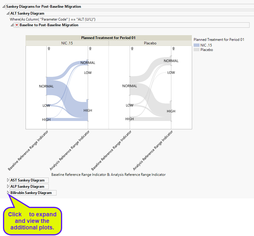 This report collects the findings test results for Bilirubin, Alanine Aminotransferase (ALT), laboratory test , Aspartate Aminotransferase (AST) and Alkaline Phosphatase (ALP), and constructs plots showing summaries of all post baseline test records for all of the patients when it finds reference range indicators. Results are grouped as high, normal, or low with respect to the Baseline Reference Range indicator and the Reference Range Indicator in each treatment arm.