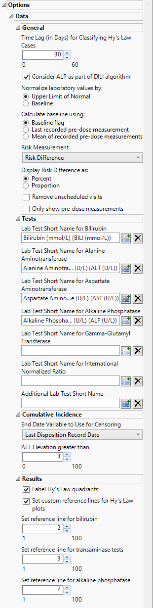 The Lab Test Short Name for Bilirubin option enables you to specify a non-standard test name for the bilirubin test. If this option is left blank, JMP Clinical uses the standard test designation.