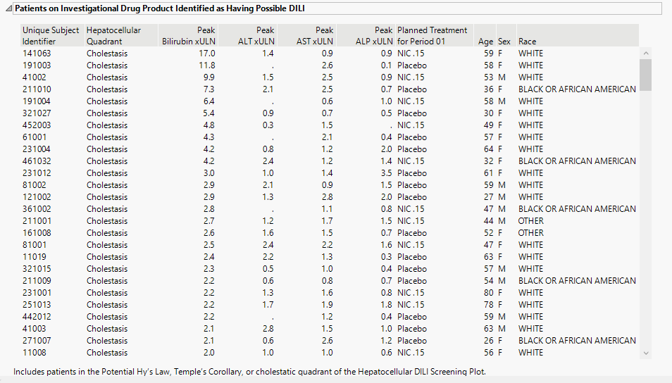 The table shown in this section summarizes the patients showing evidence (high bilirubin and/or alkaline phosphatase) of cholestatic liver injury from the Peak Liver Test Results plot above.