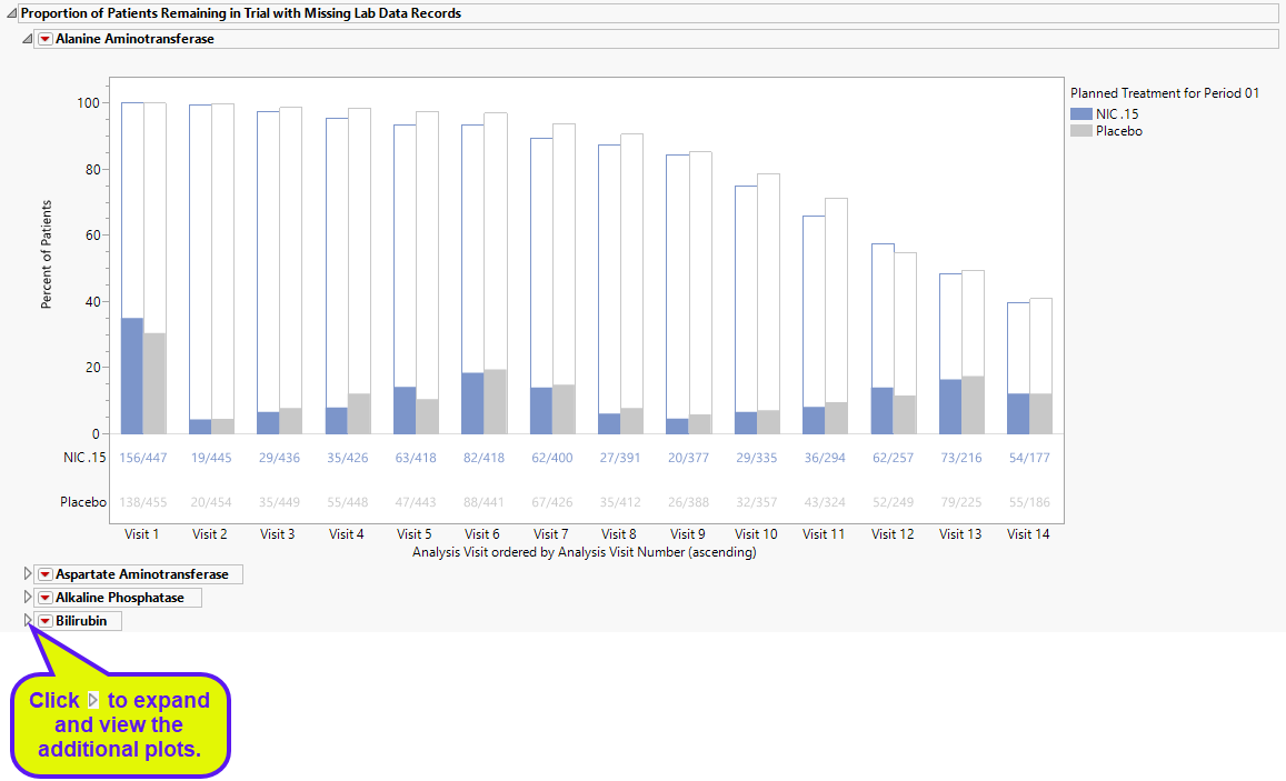 The percentage of subjects with test data at each visit is shown by the filled bars. The relative number for this group is shown below the plot. There is a separate bar for each treatment arm. The percentage of subjects missing the test data is shown by the empty bar stack atop the filled bar. The total height of the stacked bar pair indicates the percentage of subjects for each arm present at the visit.