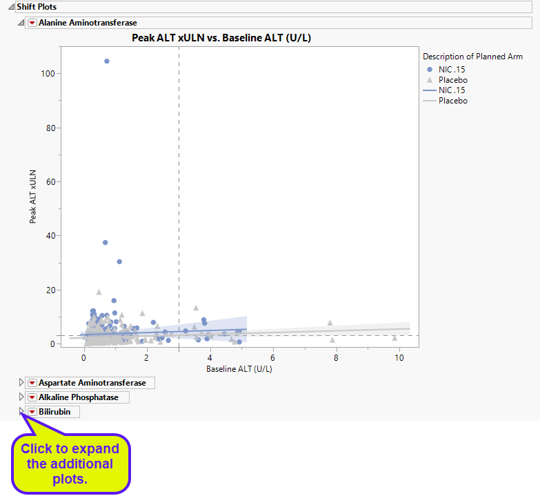 This plot shows maximum laboratory values for the Alanine Aminotransferase (ALT, shown above), laboratory test , Aspartate Aminotransferase (AST) and Alkaline Phosphatase (ALP) laboratory tests (x-axis). The maximum laboratory values for the test for Total Bilirubin (BILI) is always shown on the y-axis. The values are log10 and normalized by the Upper Limit of Normal (LBSTNRHI) (with the option to normalize by baseline values). Subjects are colored and marked by treatment arm. Reference lines are drawn by default at 3*ULN for ALT and AST and 2*ULN for BILI and ALP. These reference limits can be customized on the dialog. Additional information is listed below the plot.