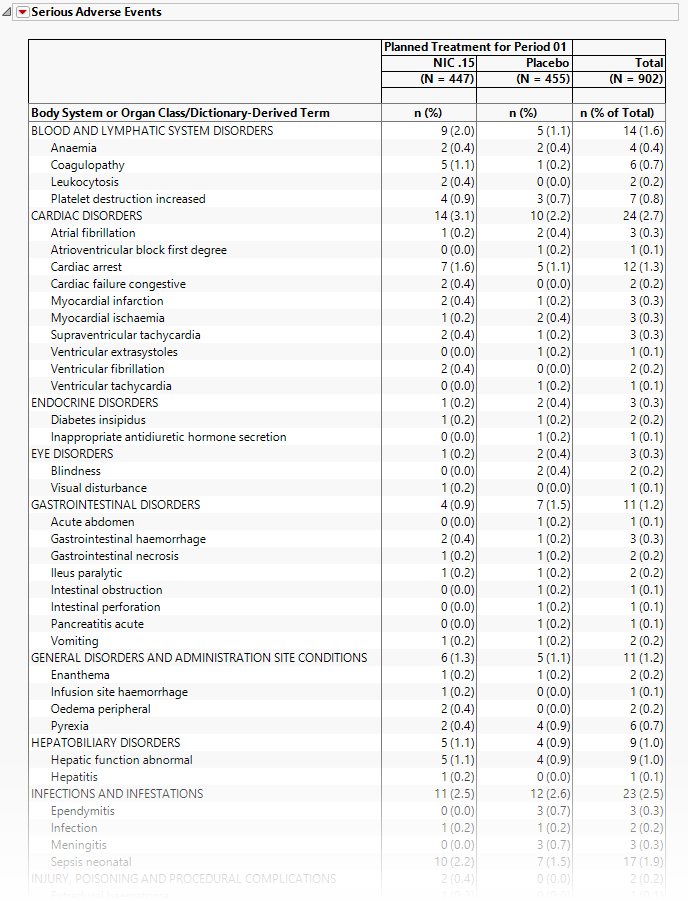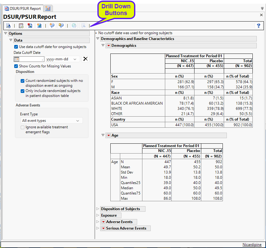 Running DSUR/PSUR Report for the Nicardipine study using default settings, generates the Report shown below.