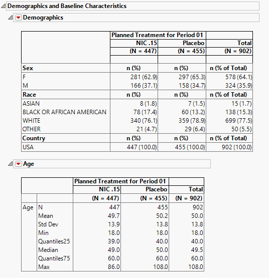 The tables in this section (shown below) summarize demographic information about the subjects in this study. The first table summarizes character data; both count and percentile data are provided by treatment arm. The second table summarizes numeric data.