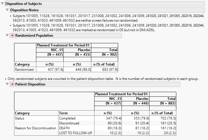The notes and tables in this section (shown below) summarize disposition information about the subjects in this study. Both count and percentile data are provided for each disposition event broken out by treatment arm.