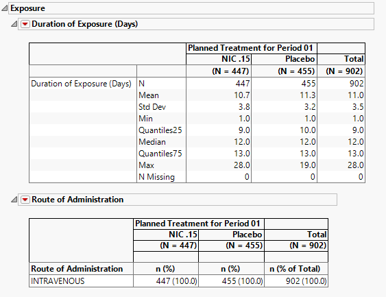 The tables in this section (shown below) summarize length of exposure by treatment arm. Treatment administration methods are also summarized.