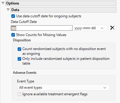 For subjects who are ongoing in the study, it is useful for indicating the date on which the data for this update report was pulled, particularly when considering exposure data. The Use data cutoff date for ongoing subjects and Data Cutoff Date widgets enable you to specify and use a data cutoff date for reporting on ongoing subjects.