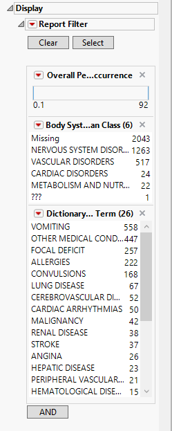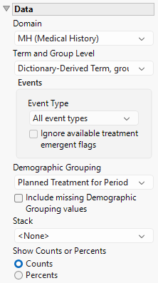Term and Group Levels are determined by the coding dictionary for the Event or Intervention domain of interest, typically these levels follow the MedDRA dictionary. Use this widget to indicate how each adverse event is named and the level at which the event is considered. For example, selecting Reported Term for the Adverse Event, grouped by Body System or Organ Class as theTerm and Group Level reports the event specified by the actual event term as reported in the AE domain on the affected organ or body system.