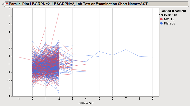 In the plot shown above, each line represents the levels of aspartate transaminase, relative to normal, in individual patients treated with nicardipine (NIC) or a placebo, over the course of the study.