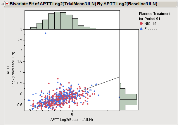 In the example plot shown here, individuals treated with either nicardipine (red) or a placebo (blue) were assayed for APTT activity before (baseline) and after treatment. Baseline measurements are plotted along the X axis and post-treatment measurements are plotted among the Y axis. Each point represents one patient. A diagonal line indicates no difference between the baseline and post-treatment values. The distributions indicate the variability in the baseline (top) and post-treatment (right) measurements.