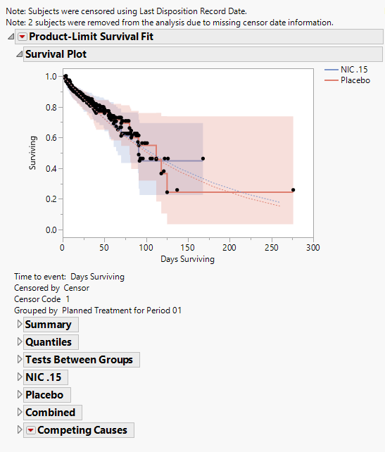 The time period of the study is plotted on the X axis and the proportion of survivors for each arm is plotted on the Y axis.