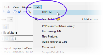 Alternatively, click on JMP Help, under the Help Menu to open the Help.