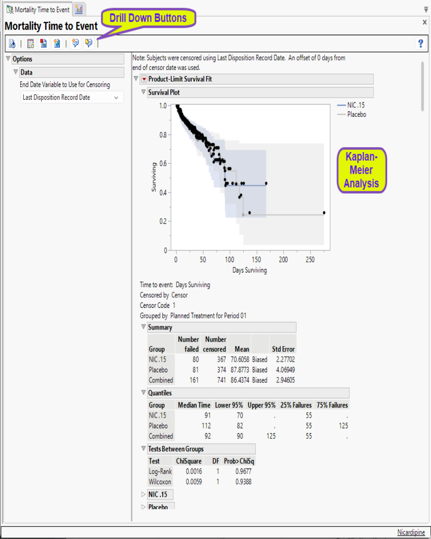 Mortality Time-to-Event groups clinical mortality results by treatment arm and generates Kaplan-Meier survival curves with associated statistics.
