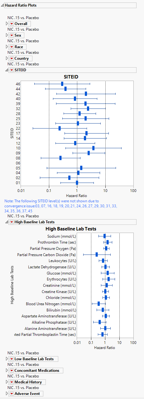 To produce the hazard ratios, the preference for control level must be set to a level other than None. Any subgroups in the hazard ratios that cause a convergence issue are removed from the analysis and a note is displayed under the plots for which subgroups were removed.