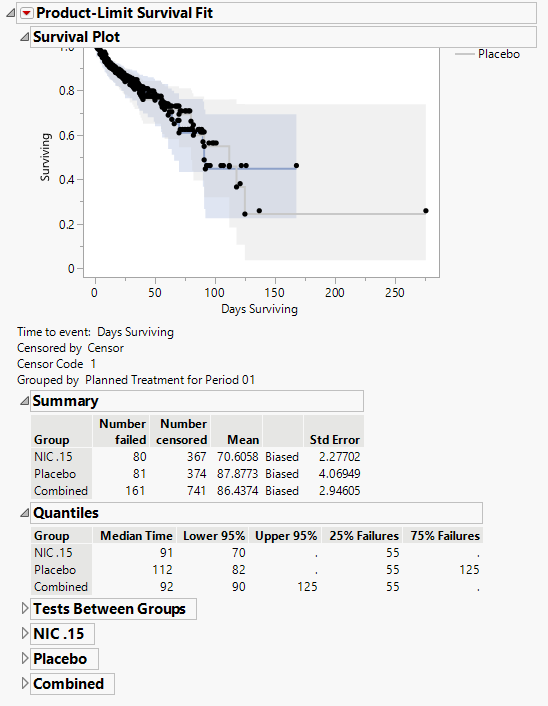 Contains a Kaplan-Meier time-to-event analysis and associated statistics