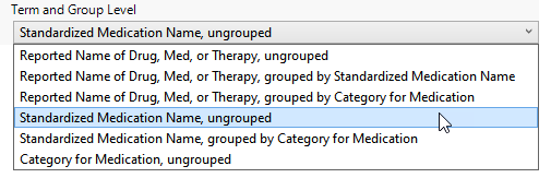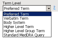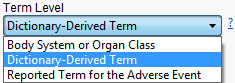 Use this option to specify which level of terms (for example, adverse event, intervention, or MedDRA) to use as categories.