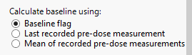 Choose Last recorded pre-dose measurement to use the last recorded pre-dose test measurement (out of the test measurement pool generated from the above list) as the baseline measurement.
