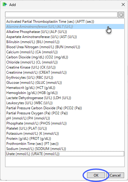 In this example, Alanine Aminotransferase (ALT) was selected and added.