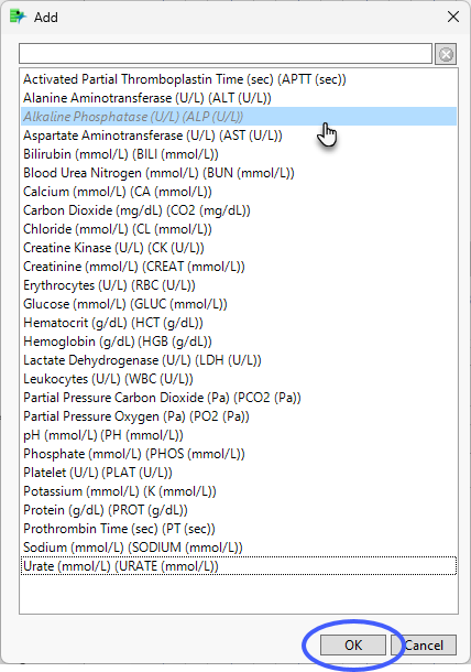 | 8 | Select the designation for the alkaline phosphatase test and click to add the test name to the text box. |