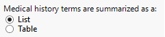 Use this option to specify whether to summarize the medical history terms as a list in the introductory paragraph or in a table.