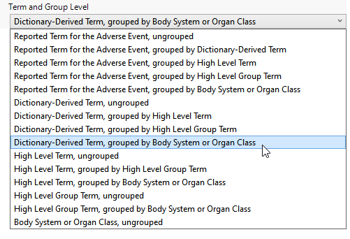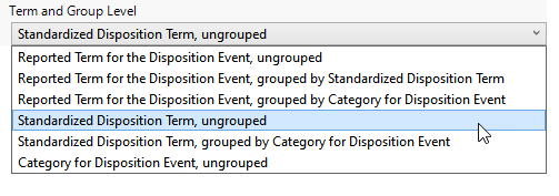 Note: Multiple domains use this parameter. Input data determines the availability of options. Not all group levels are available in all of the reports in which term levels are specified.