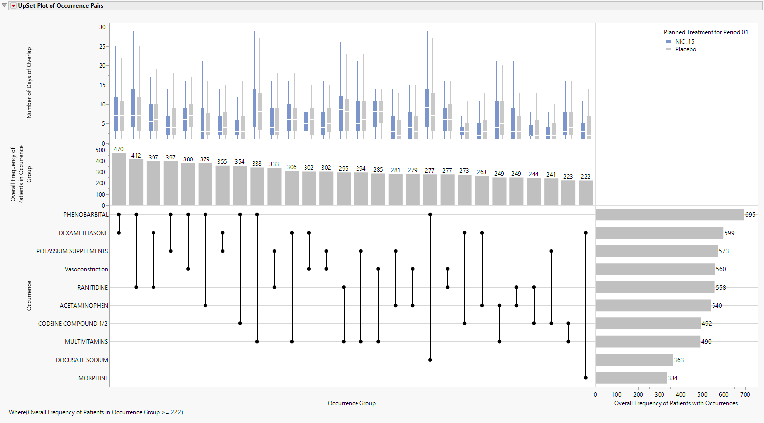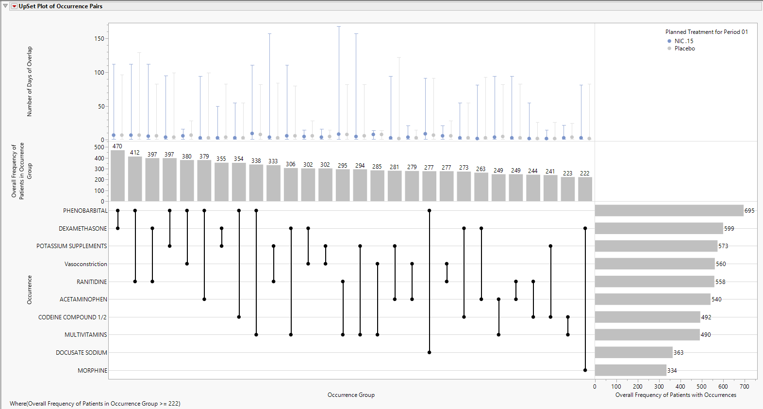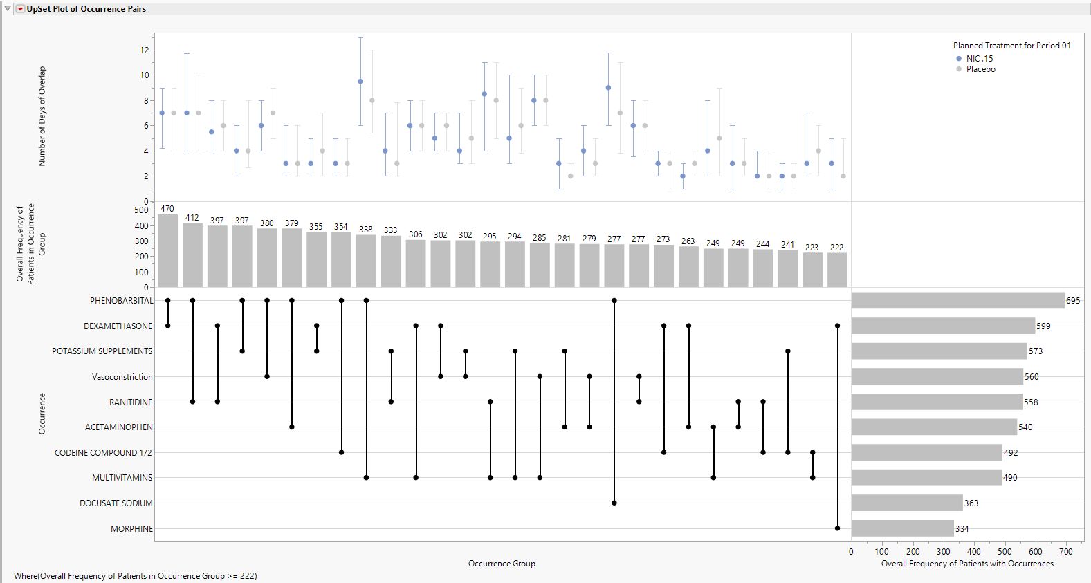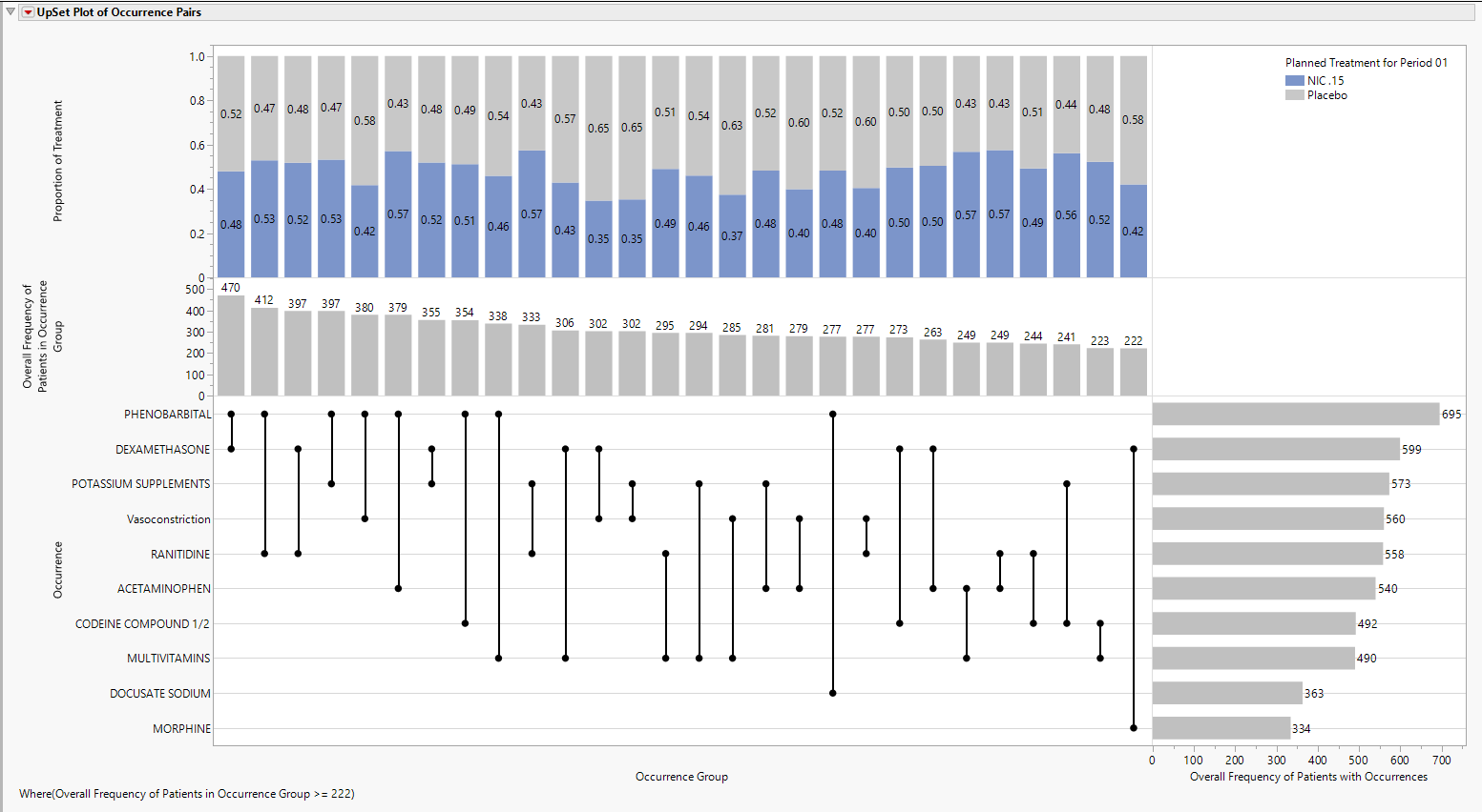 UpSet plots are used to communicate the frequency of subgroups produced according to one or more factors compared to the marginal frequencies of considering each factor alone.