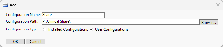 New Configuration references are added using the Configuration Manager in JMP Clinical. If the root folder for the Configuration to be added already exists and contains an installation.path.preferences and system.clinical.preferences, the user will be prompted whether to use those existing definitions or reset them to the defaults.