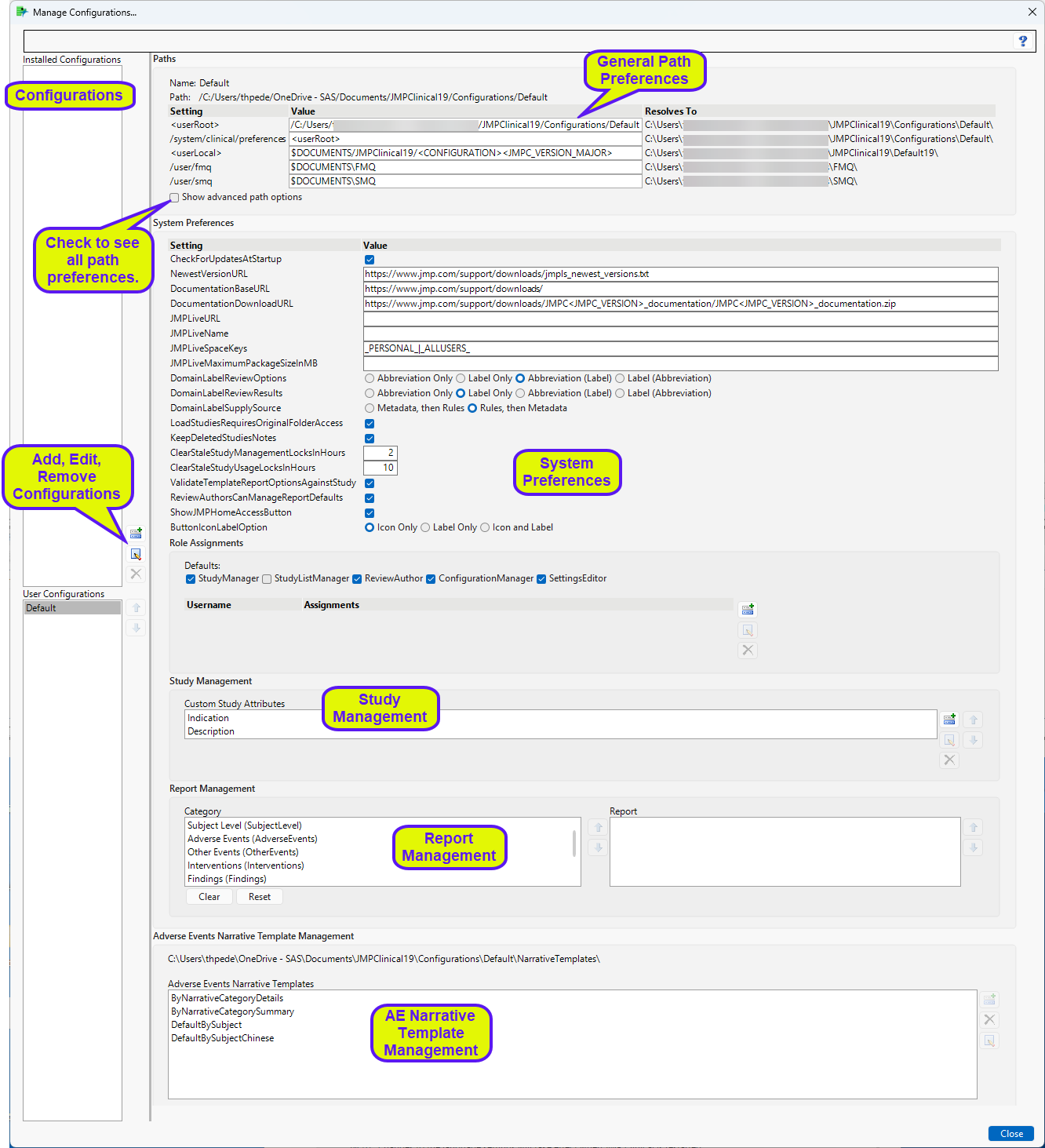 The installation.path.preferences file contains all the path locations that can be configured to change where JMP Clinical reads and writes for system operations. The Default "Local" configuration shipped with the product looks for this file in the install directory. All default paths use a local configuration and store metadata under the JMP Clinical application data USER ROAMING profile (C:\Users\<username>\Documents\JMPClinical19\Configurations\Default).