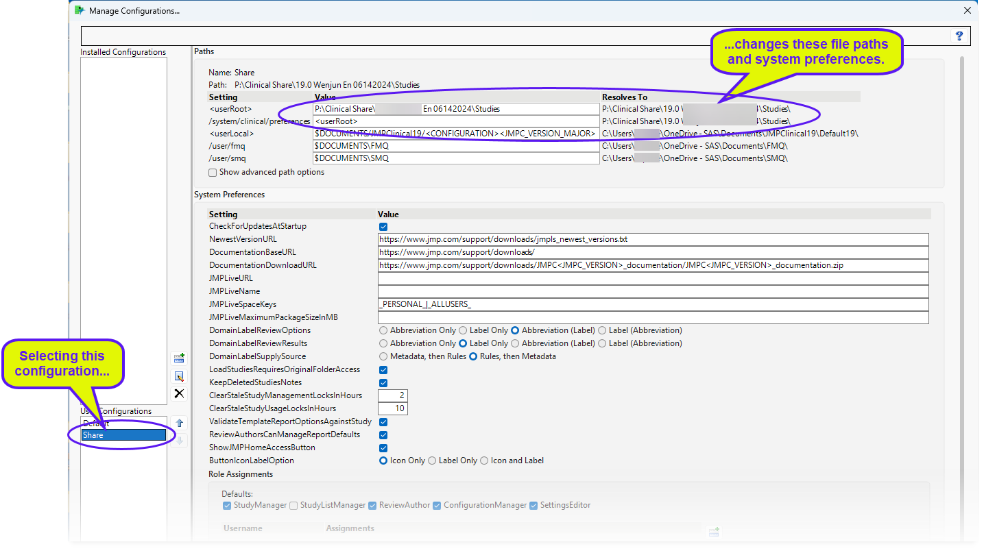JMP Clinical supports multiple configurations that can define a distinct set of folders where study metadata and report output is stored. One of the main purposes of this feature is to enable sharing of studies and reviews (at varying levels) using shared (or mapped) network drives across a set of users.