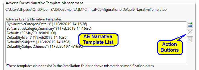 The Adverse Events Narrative Templates section lists all of the templates currently in the selected configuration. The templates are listed by their names (name of the base VM file) and the date/time of the last modification. You can add, remove, or edit templates using the action buttons.