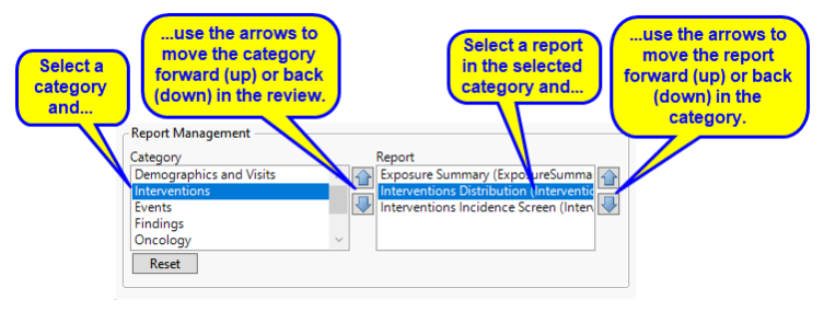 The Report Management option enables you to specify the order in which the report categories and the reports themselves are presented in the review.