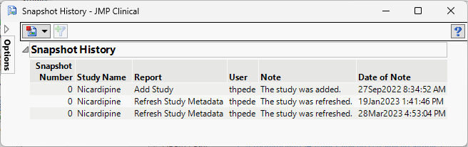 This report creates a summary report of the snapshot history for the currently selected study.