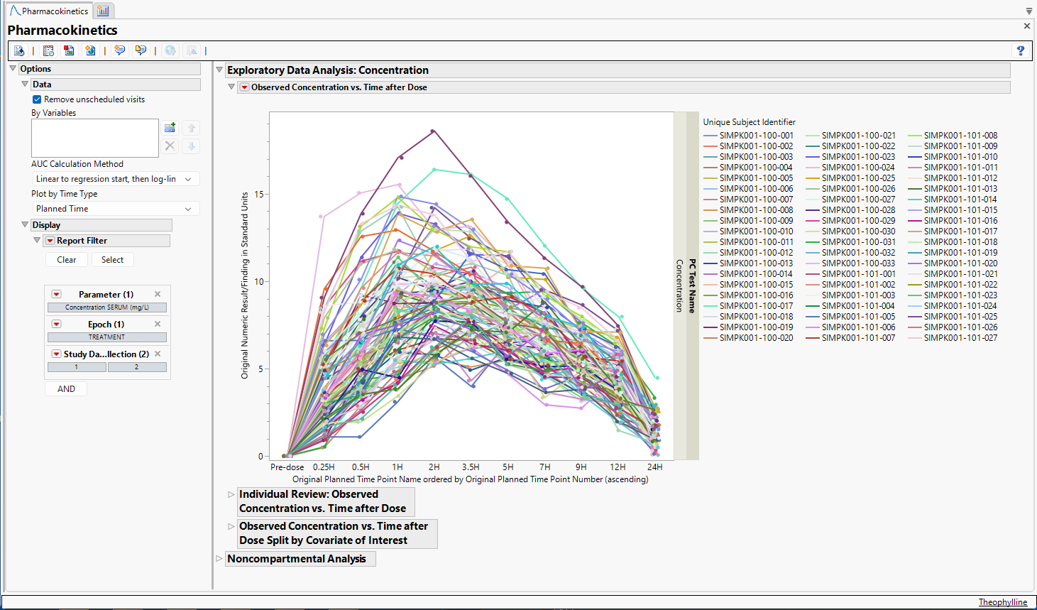 The standard Nicardipine sample study typically used in this User Guide does not have concentration data available in a PC domain and is suitable for use with this report. A simulated clinical trial data set, based on the Theophylline data that were described in Pinheiro & Bates (1995), is now included in the JMP Clinical Sample Data folder. Theophylline is a bronchodilator used to treat the symptoms of asthma and other lung diseases.