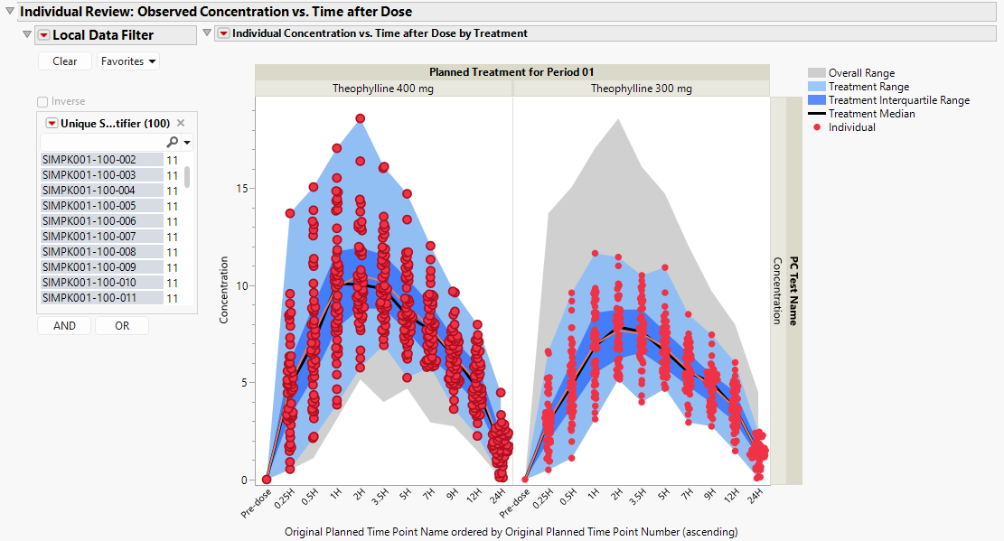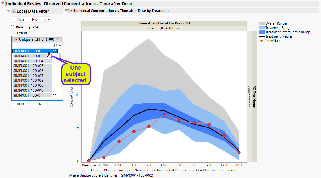 The Local Data Filter can be used to subset to an individual patient to view their particular pk concentration profile. This view makes it possible to assess the individual’s pharmacokinetics in the context of the entire treatment arm as well as across all patients.