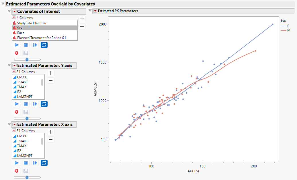 The scatter plot enables you to view pairs of PK parameters with non-parametric curves to assess their bivariate relationship.