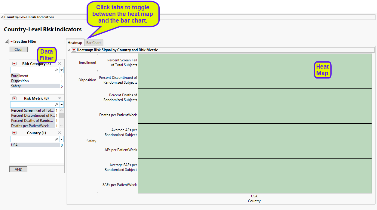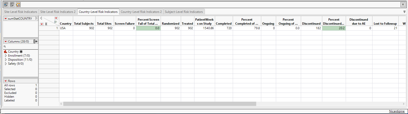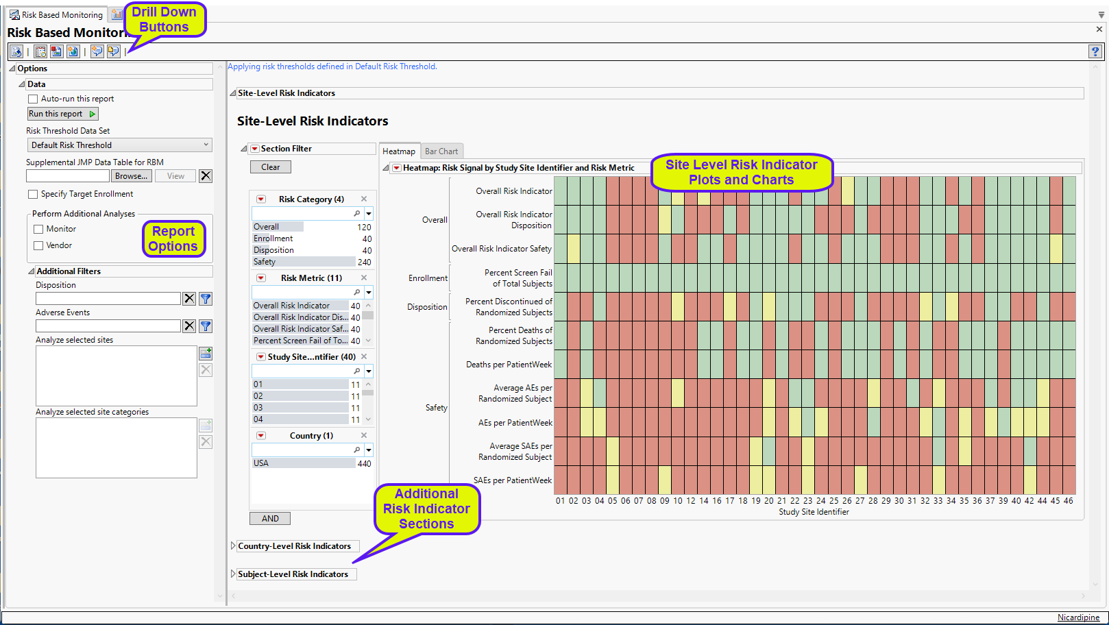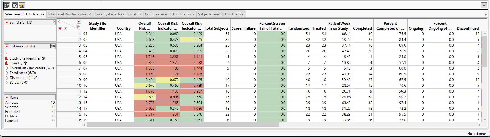 | • | Site-Level Risk Indicators: This data table displays risk indicators summarized at the site level. Risk indicators with defined thresholds are colored in green, yellow, or red. Each site-level risk indicator is in a separate column. This is a "short" and "wide" data table. |