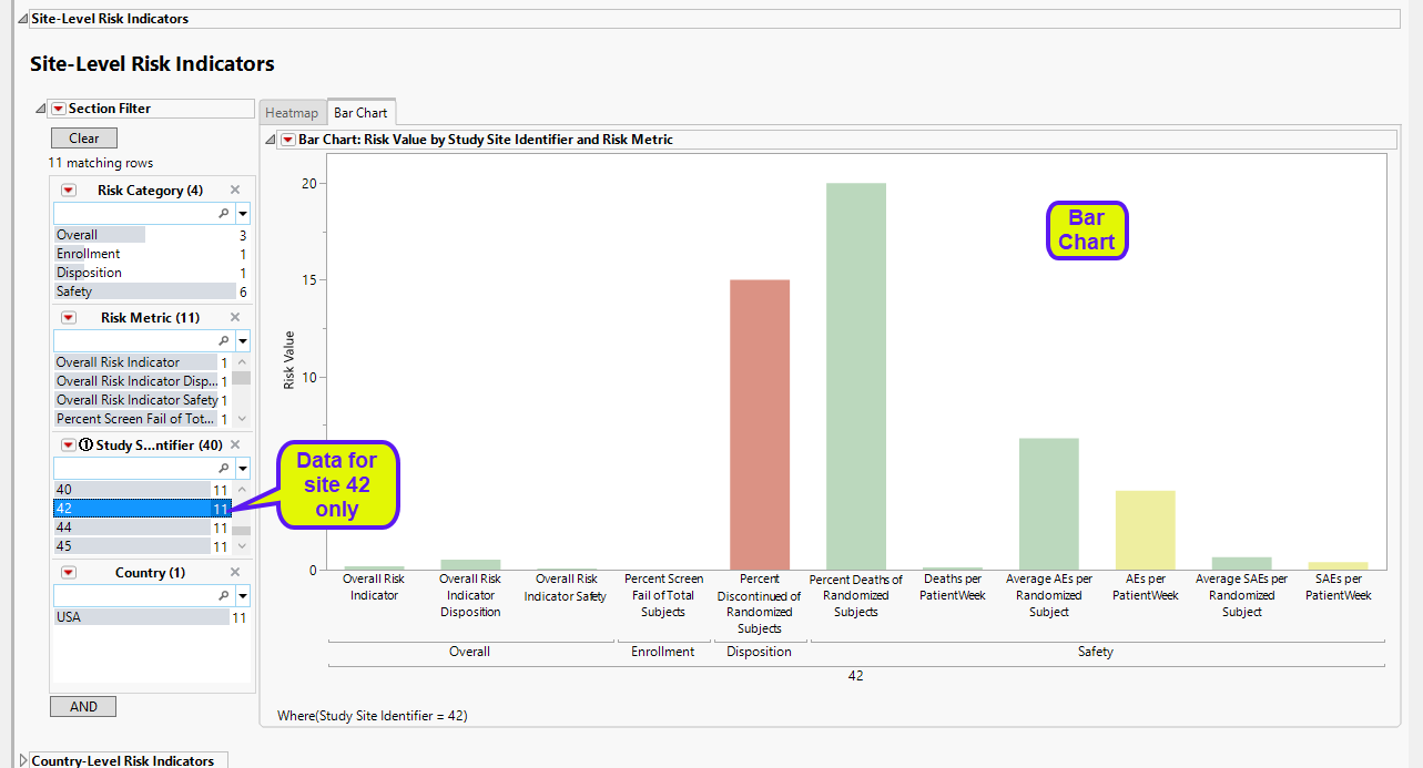 | • | A bar chart showing the risk value for each indicator across the sites. The data in the following bar chart were filtered to site 42 only. |