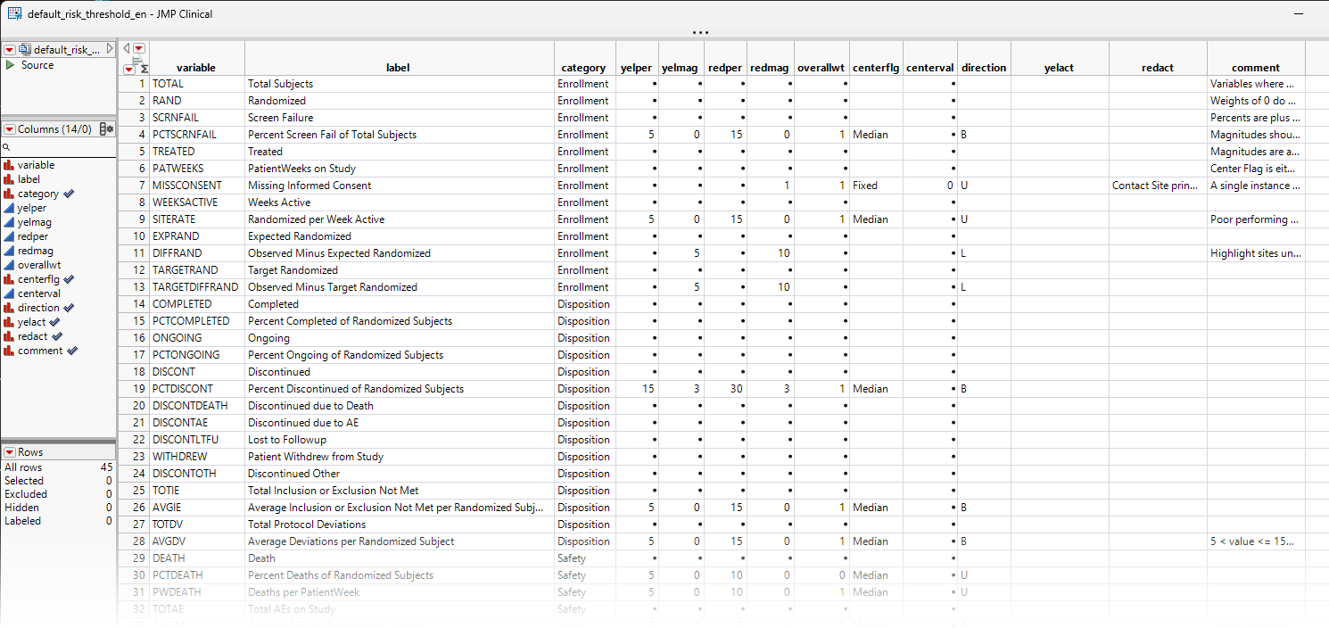 In order to run the Risk Based Monitoring report a third external file is needed that defines the risk thresholds. JMP Clinical ships with the Default Risk Threshold data table (shown below) so that you can begin performing your RBM analysis as soon as possible, and to assist with developing your own risk threshold data sets. Refer to Manage Risk Threshold Data Tables... for more information on generating and modifying the risk threshold table.