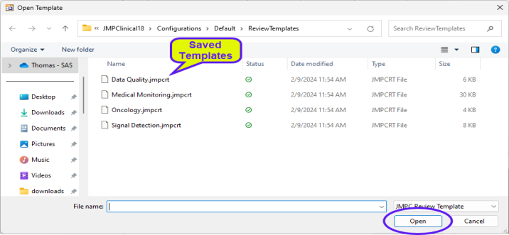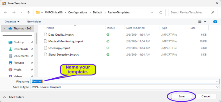 Note: By default, review templates are saved to C:\Users\username\Documents\JMPClinical19\Configurations\Default\ReviewTemplates. If you want to save your templates elsewhere, simply navigate to the correct location before clicking .