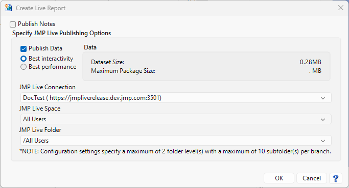 Check the box to include all data sets with your JMP Live report. You can choose to format the data for Best interactivity, where all supported aspects of the report are fully interactive, or Best performance, where images and graphs are not interactive, but supported data in the rest of the report remains interactive.